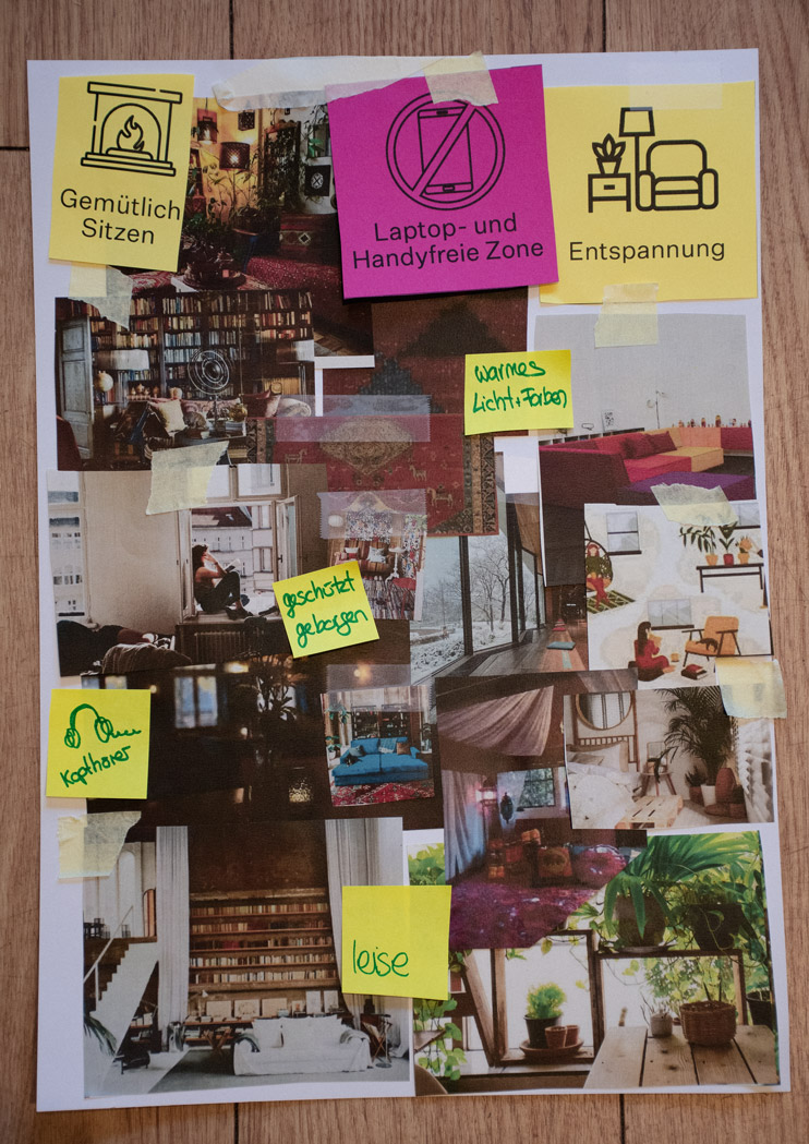 Auf Basis der gesammelten Bedürfnisse und Impulse startete eine SwaF-Arbeitsgruppe im zweiten Schritt in die Ausarbeitung des Raum-Konzeptes. Auch hier haben wir uns Verstärkung dazu geholt: Gemeinsam mit dem Spatial Designer Bastian Braun hat das Team mit Schere und Kleber ein Raumkonzept entworfen, das Antworten findet auf die vielfältigen Bedürfnisse und Wünsche der SwaF-Community.